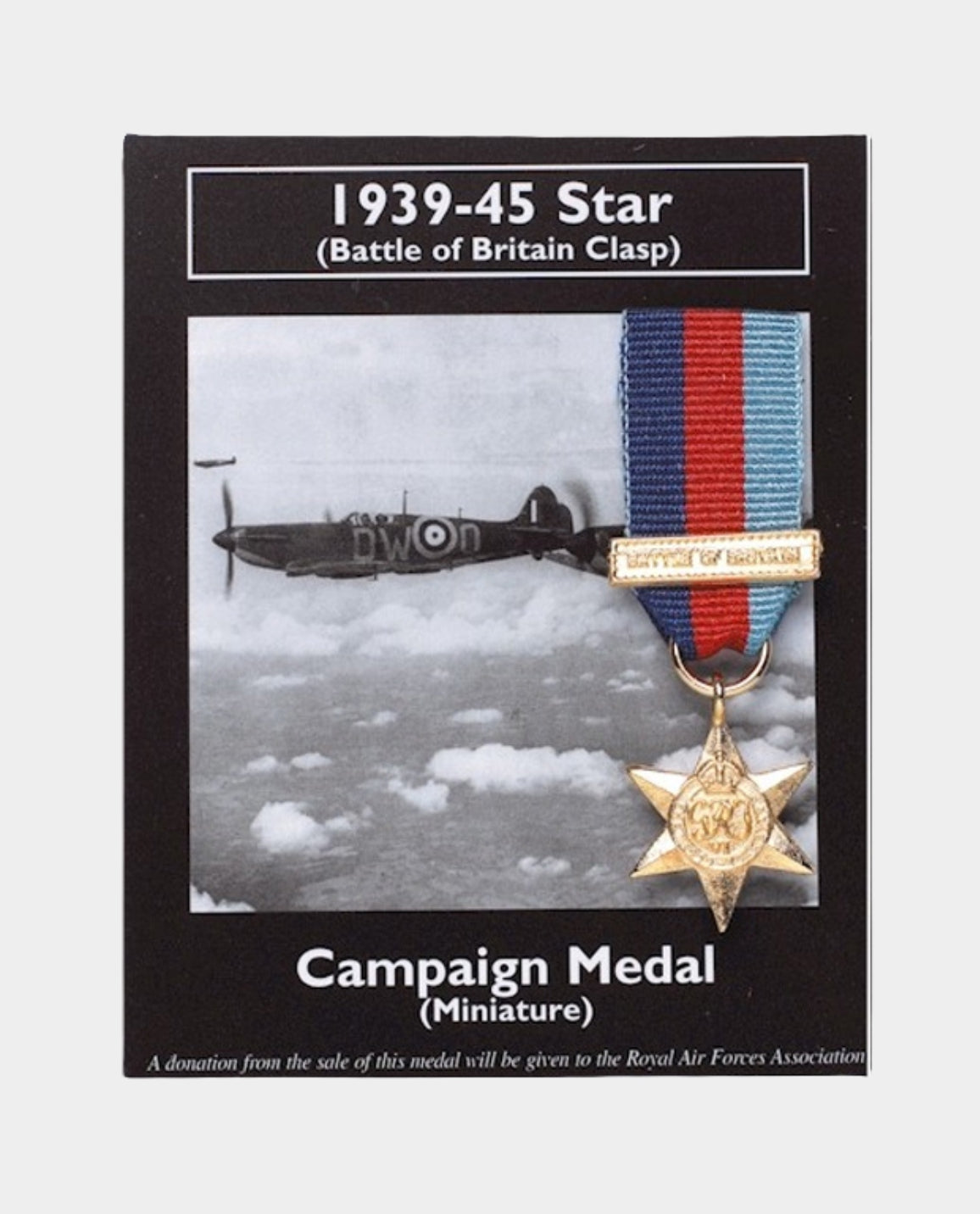This reproduction Battle of Britain Medal is an accurate replica of the 1939-45 Star Medal with the Battle of Britain clasp. Made from 22ct gold-plated lead-free pewter, it comes on a red and blue ribbon.