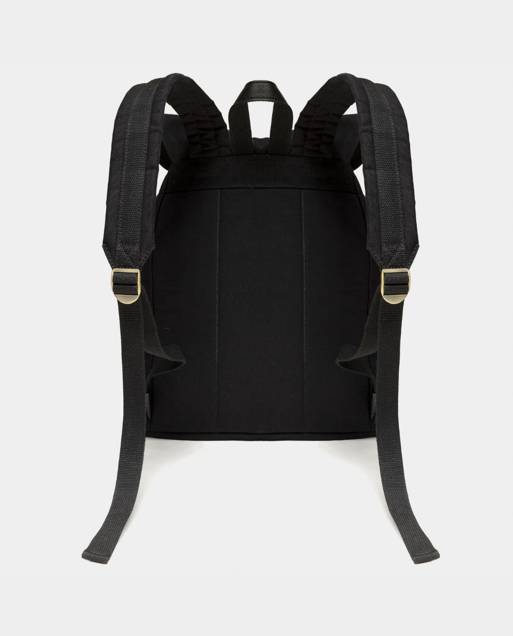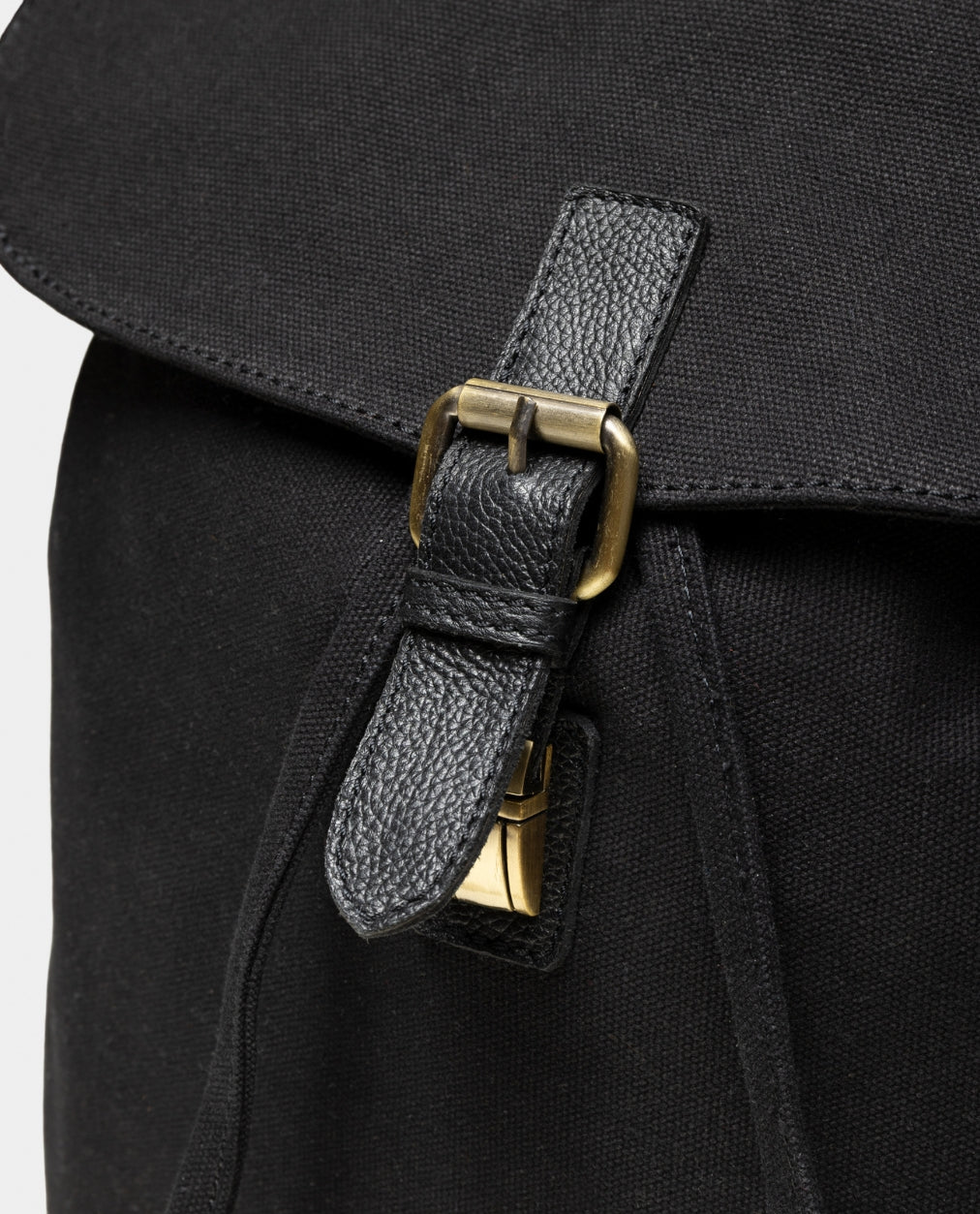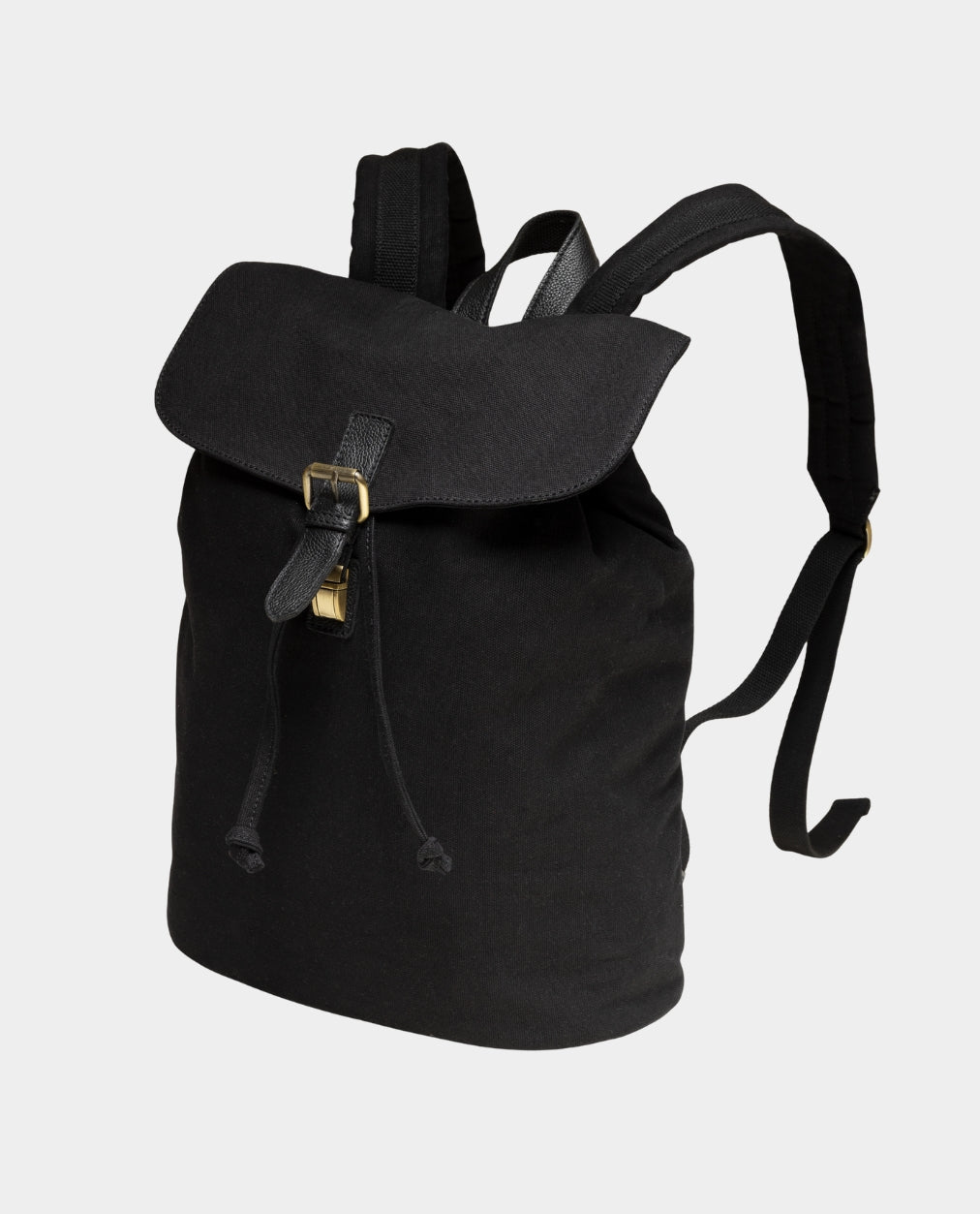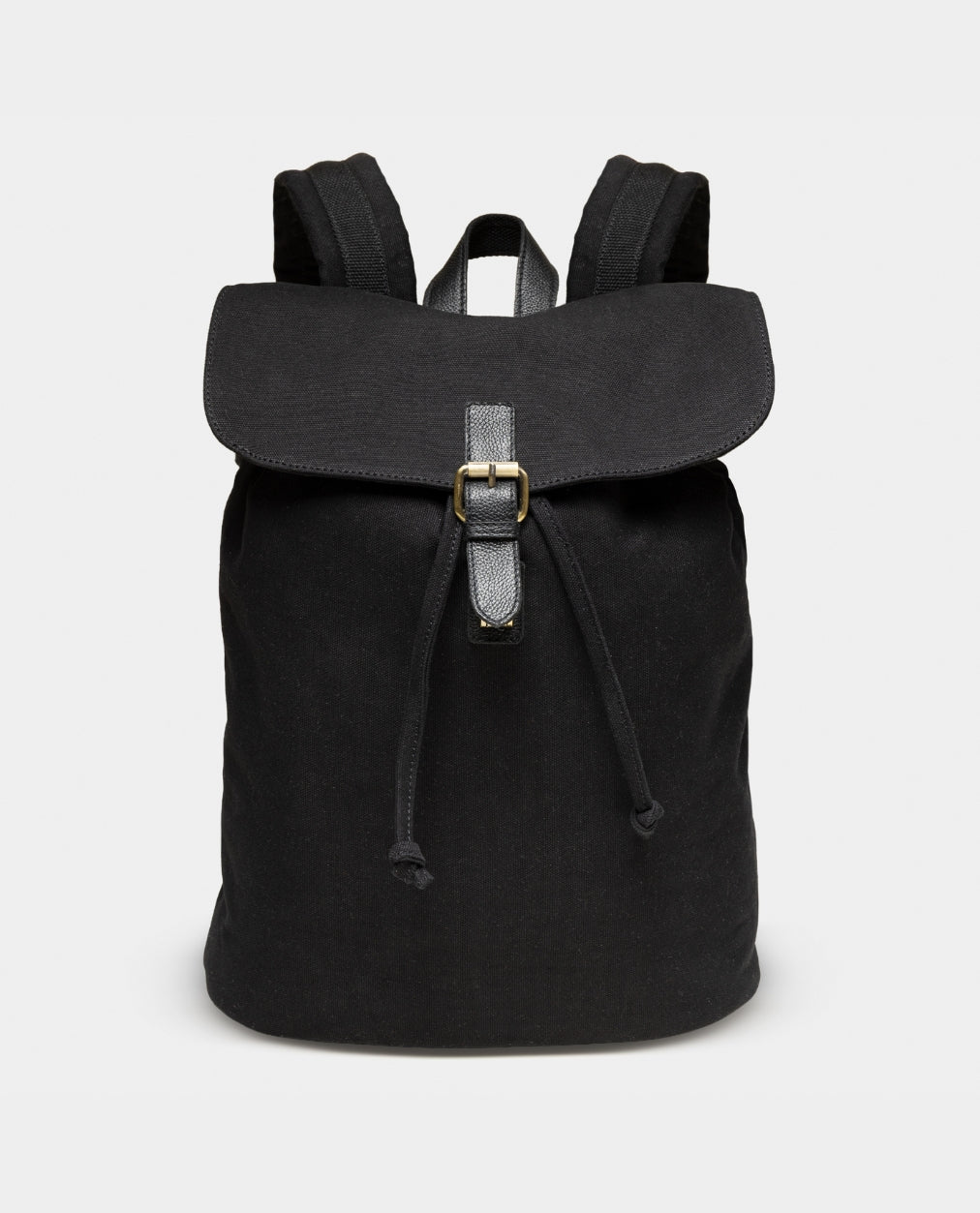 A stylish yet practical addition to your everyday, this black canvas backpack with leather trims features a small internal zipped pocket, a faux buckle popper closure, adjustable straps, and a padded internal laptop pocket.
