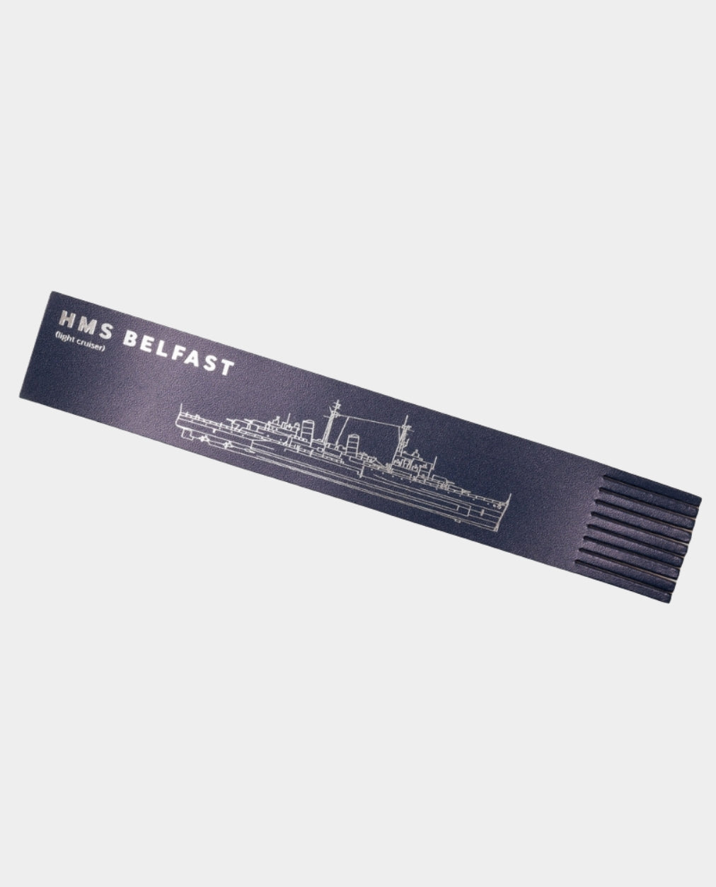 Recycled leather bookmark, embossed with the blueprint of HMS Belfast taken from IWM's collections, some of which are still held on HMS Belfast to this day.