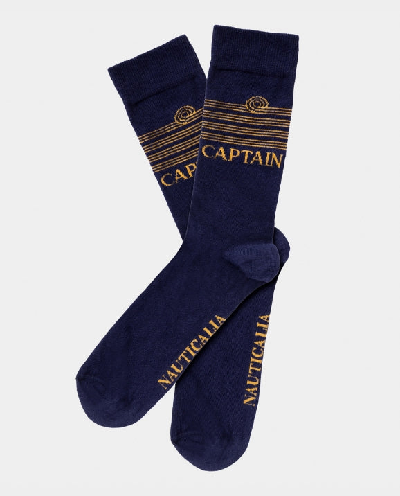 Navy blue socks knitted with the Captain insignia and inspired by the life and times on board HMS Belfast.