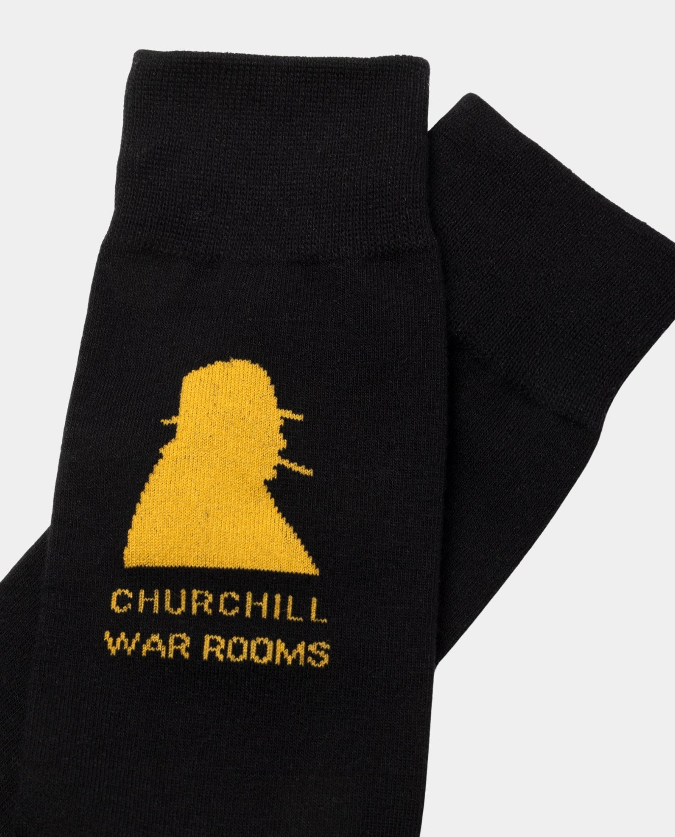 The socks feature a bold golden yellow design on black, echoing the original Churchill War Rooms signage and paired with a silhouette of Churchill himself. Comfortable and distinctive, they offer a stylish way to honour the legacy of Britain’s wartime leadership.