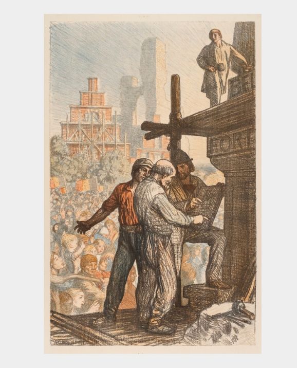 The Efforts and Ideals series were made as limited edition of lithographic prints of each work commissioned by the British Government during the First World War and given to various heritage institutions to store for future sale, including Imperial War Museums. This print has been agreed to be sold to raise funds for our collections Art department and more copies have been retained in our storage.