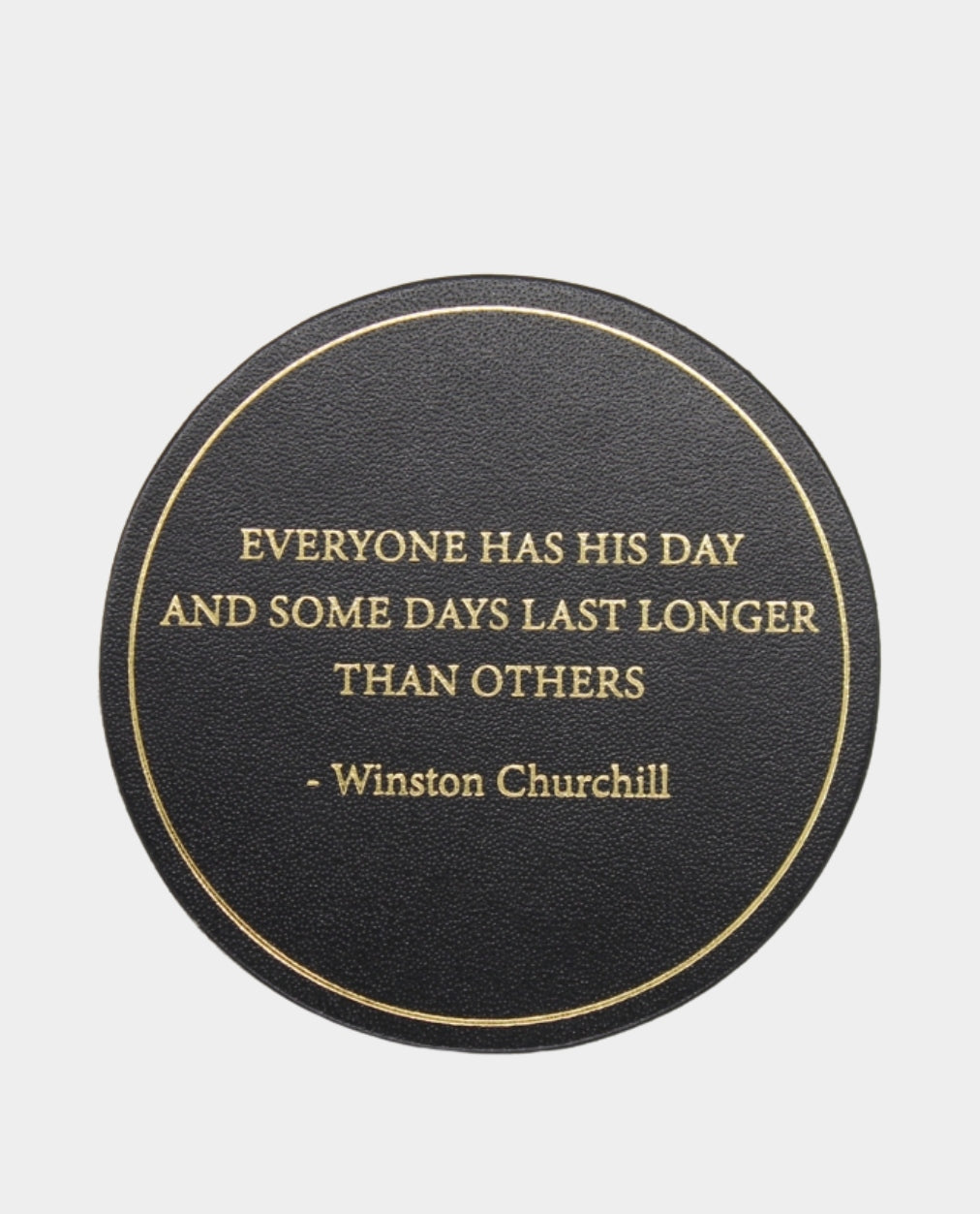 Recycled leather coaster featuring the Churchill quote "Everyone has his day, and some days last longer than others".