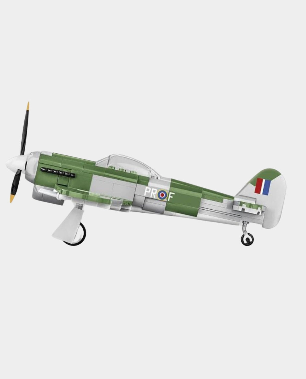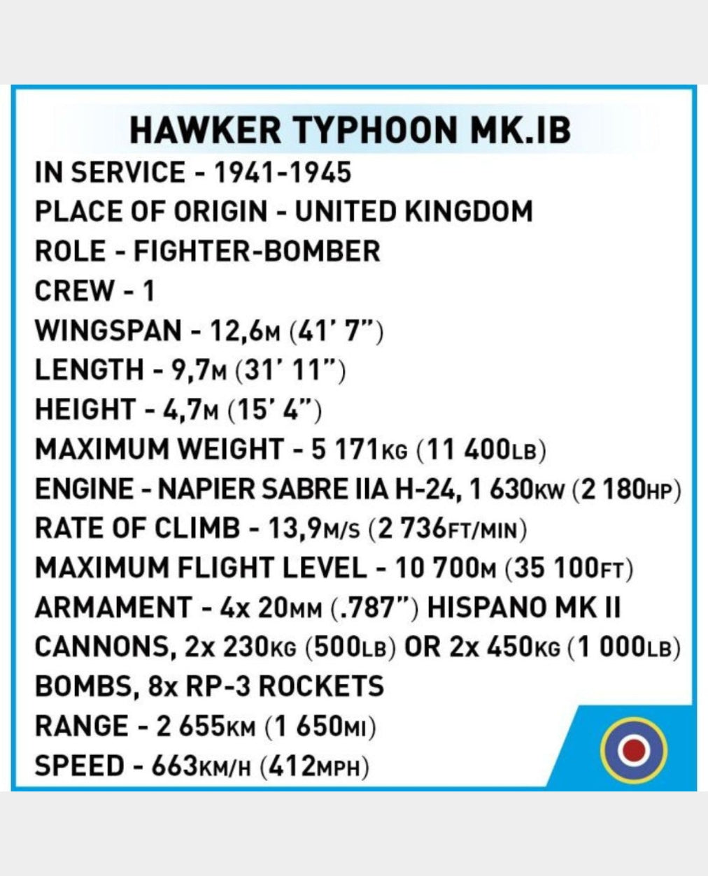 A British fighter-bomber aircraft in service with the British RAF since 1941. Its main task was to combat German fighter aircraft as well as to support frontline operations by attacking ground targets. Typhoon was known for its high top speed of over 660 km/h and powerful armament. Four 20mm Hispano-Suiza cannons made it effective in destroying surface targets.
