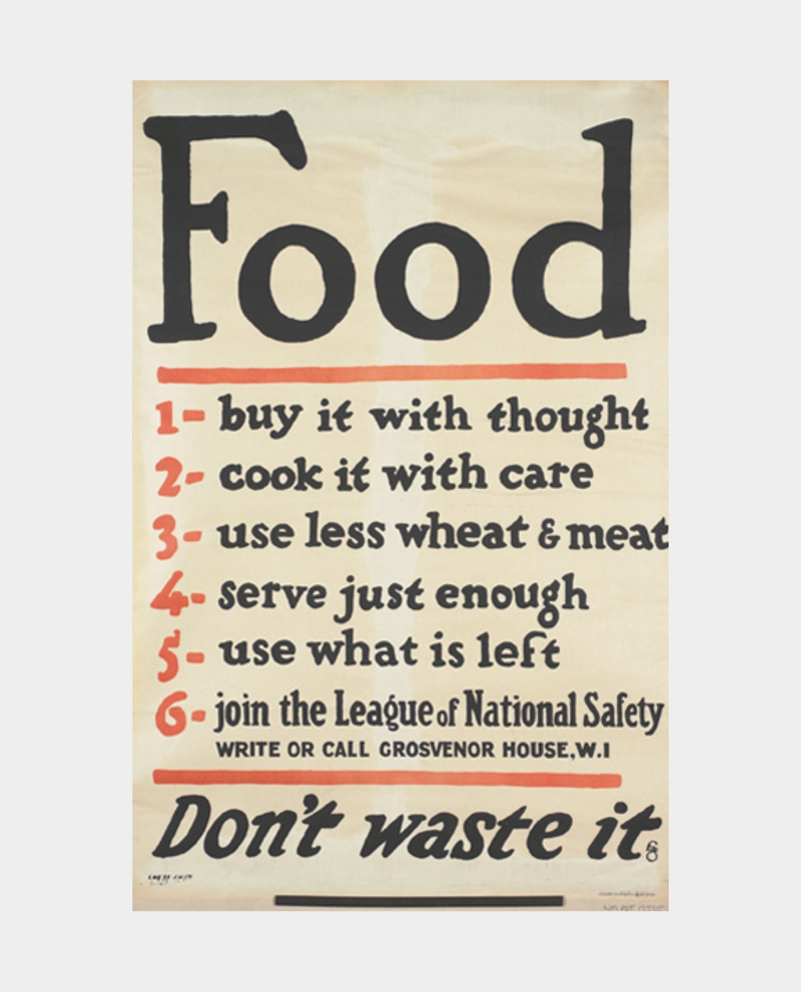 In response, the British government initially introduced a voluntary rationing scheme, issuing posters such as this one, that encouraged self-restraint in food consumption.