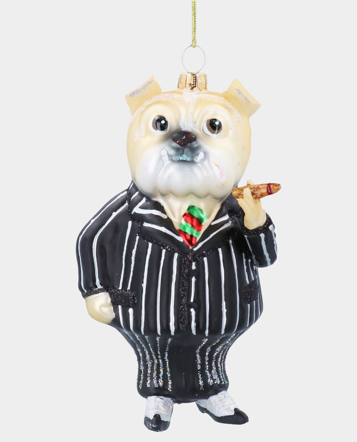 Add a touch of character to your Christmas tree with this Churchill Bulldog glass decoration, featuring a bulldog dressed in a glitter-embellished pinstripe suit and holding Churchill’s signature cigar.