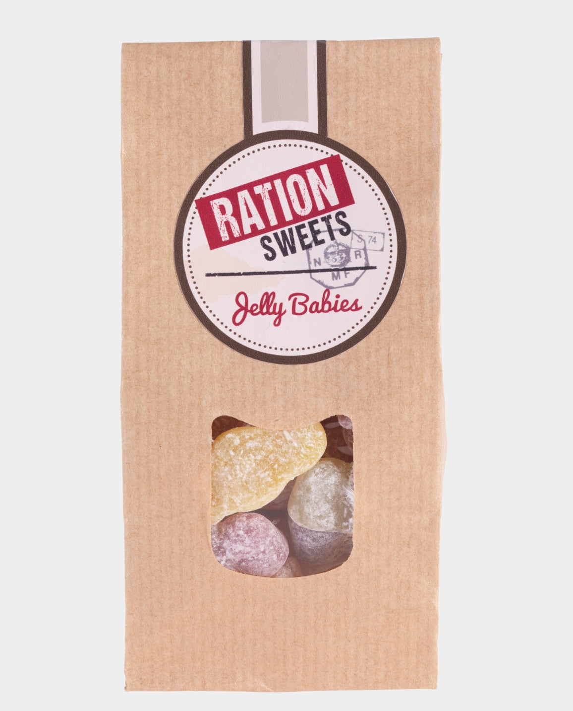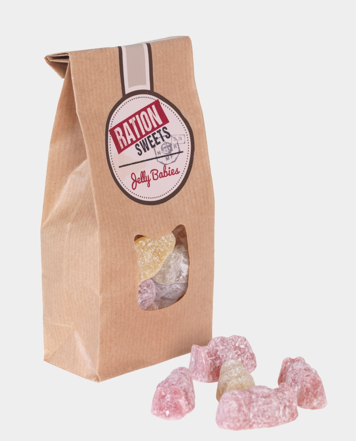 170g ration sweets bag filled with jelly babies. This bag contains 2 weeks of your sweet ration in 1945.