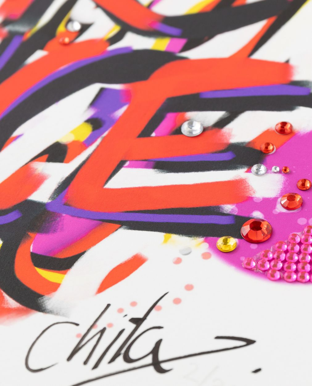 Each edition is hand-finished by the artist, with unique embellishments personally chosen by Chila, ensuring no two prints are alike. Every piece is signed and numbered by the artist and comes with a certificate of authenticity.