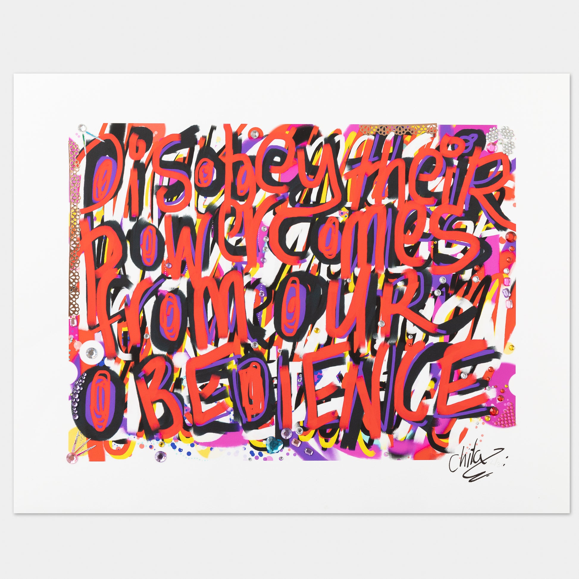 Own a piece of contemporary art history with this exclusive limited edition print of Chila Burman’s powerful drawing Disobey – their power comes from our obedience. Originally featured as part of Burman’s acclaimed neon installation for her major commission Chila Welcomes You at IWM North, this striking work has been reimagined as a collectible print.