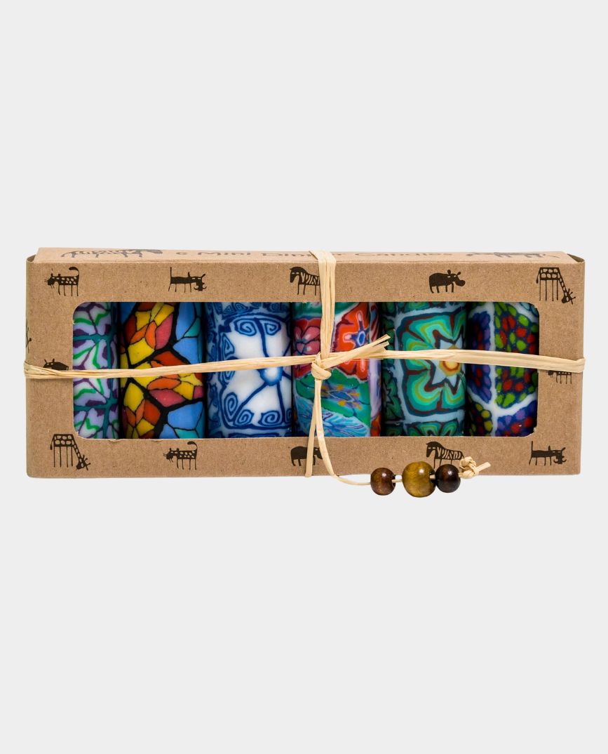 This set of six Swazi candles is handcrafted in the Kingdom of Eswatini (formerly Swaziland), Southern Africa. Each candle features a vibrant millefiori design — an ancient technique meaning “a thousand flowers,” adapted from Venetian glasswork and reimagined in wax by skilled candlemakers.