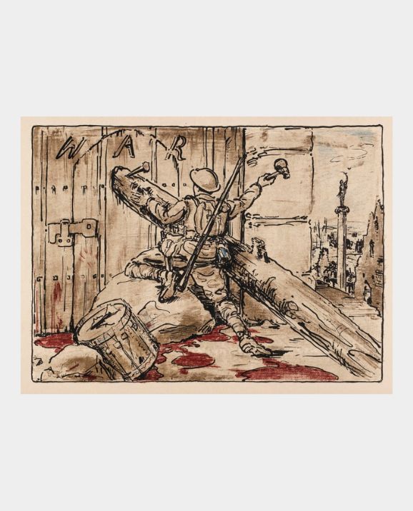 In William Nicholson's lithograph End of War, a British soldier is depicted striking a decisive blow as he nails shut the door on war, symbolising a final closure to the conflict. The surrounding scene is marked by ruin and bloodstains, echoing the recent devastation. Nicholson, born in Newark-on-Trent, received his education at Herkomer's School in Bushey and the Académie Julian in Paris. His artistic career was diverse, encompassing painting, engraving, and notably, innovative poster designs.