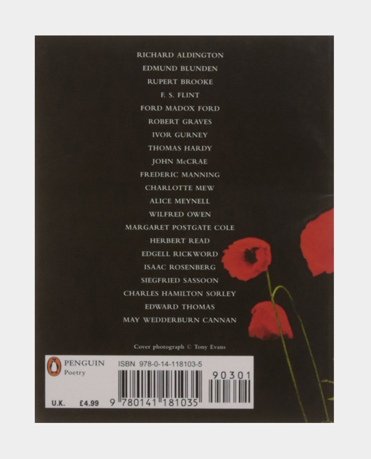 The work of 21 poets is represented including Rupert Brooke, Robert Graves, Ivor Gurney, Thomas Hardy, Charlotte Mew, Alice Meynell, Wilfred Owen, Herbert Read, Isaac Rosenberg, Siegfried Sassoon and Edward Thomas.