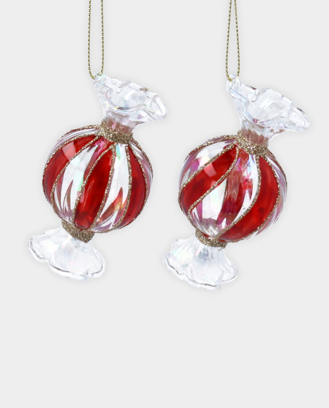 Add a nostalgic touch to your festive décor with this striped glass sweet decoration, inspired by traditional hard candies popular during the Second World War. Available in assorted designs with either straight or gently wavy red and clear stripes, each piece captures the charm of vintage Christmas celebrations.