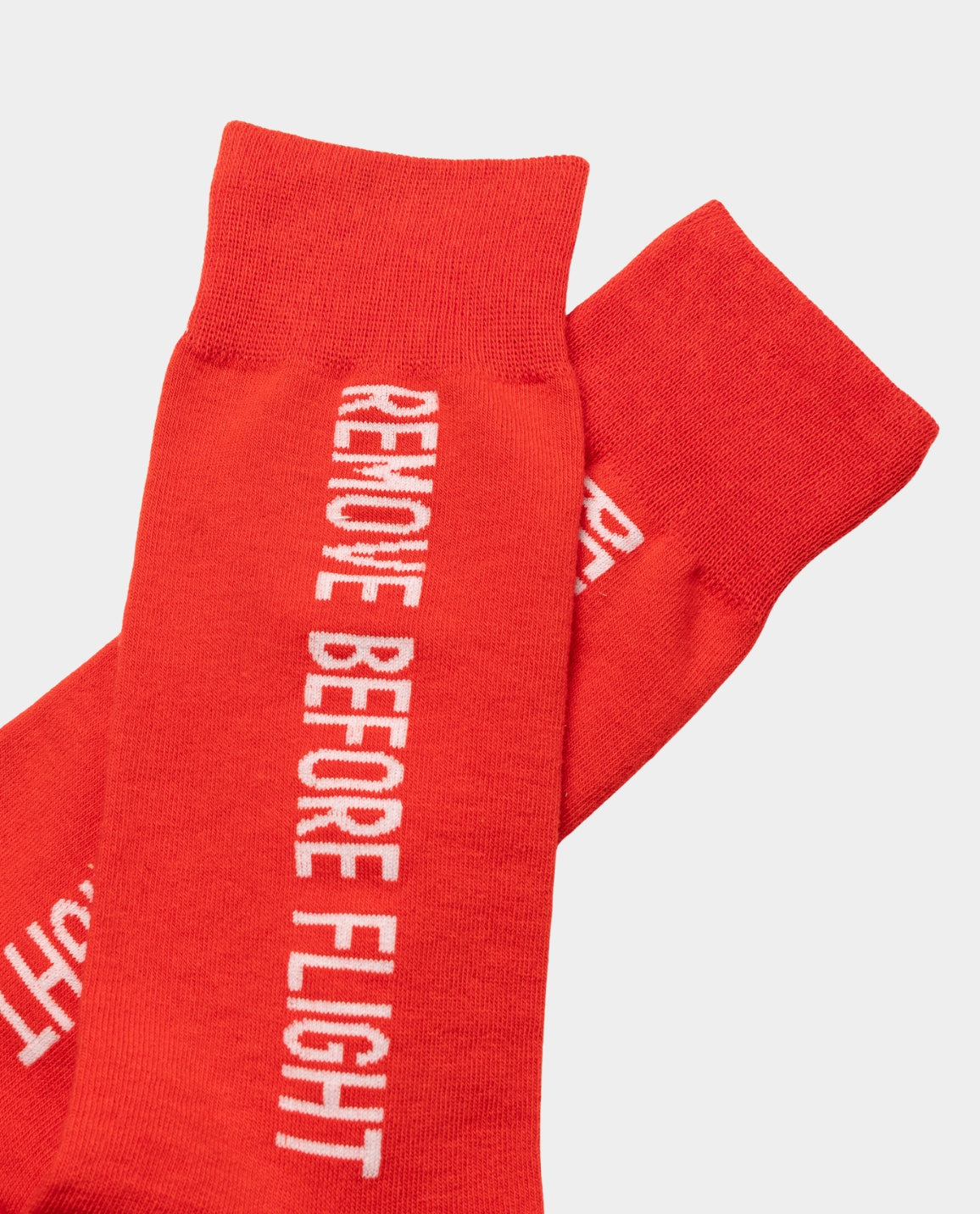 Add a bold touch to your everyday essentials with these vibrant red socks, featuring the iconic ‘Remove Before Flight’ slogan.