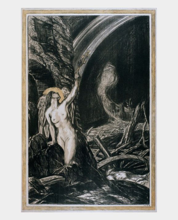 There is a strong theme of renewal in many of the Ideals; Charles Shannon’s ‘Rebirth of the Arts’ (ironically) embodies the anxiety that the barbarism of war eclipses artistic activity. Yet it holds promise that there will be a rebirth once the guns fall silent. Augustus John’s ‘The Dawn’ employs the same motif of a female nude gazing up at the heavens, away from the death and destruction below. There is even a child busy building at her feet, embodying hope for the future.
