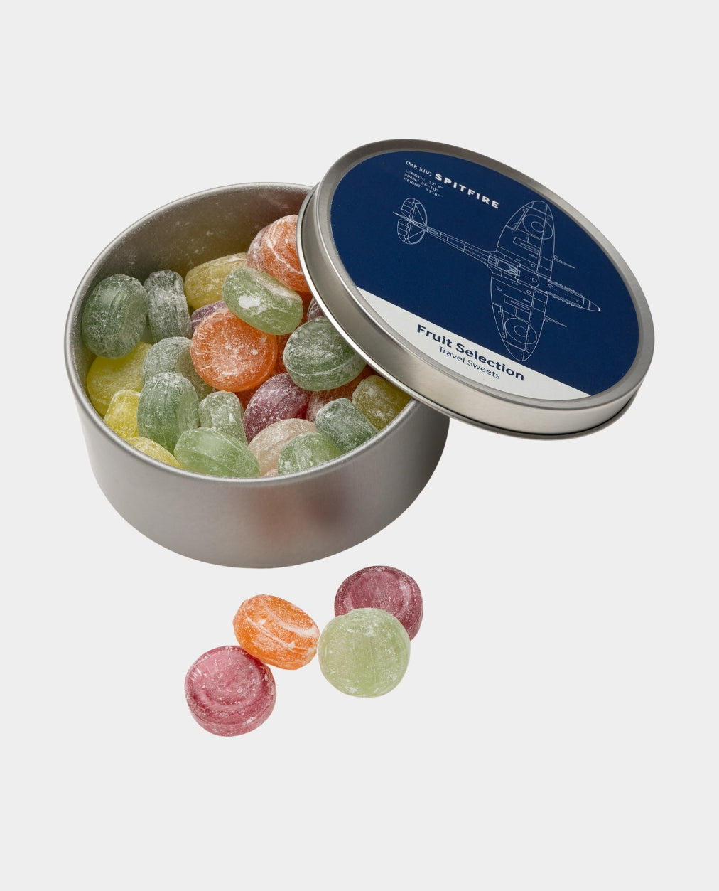 Fruit selection flavoured boiled sweets in a round metal tin featuring out bestselling Spitfire blueprint design.
